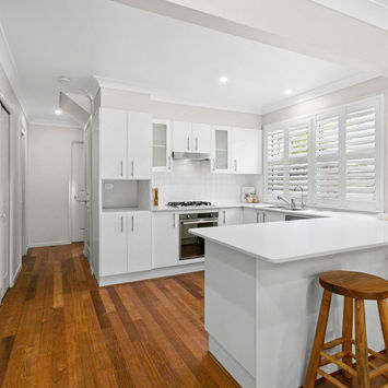 - Timber flooring with crisp white plantation shutters